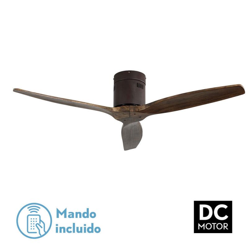 Realizado en metal con tres aspas de madera. Motor DC. Control de aire verano o invierno. Mando a distancia incluido con temporizador de apagado de 1/4/8 Horas.